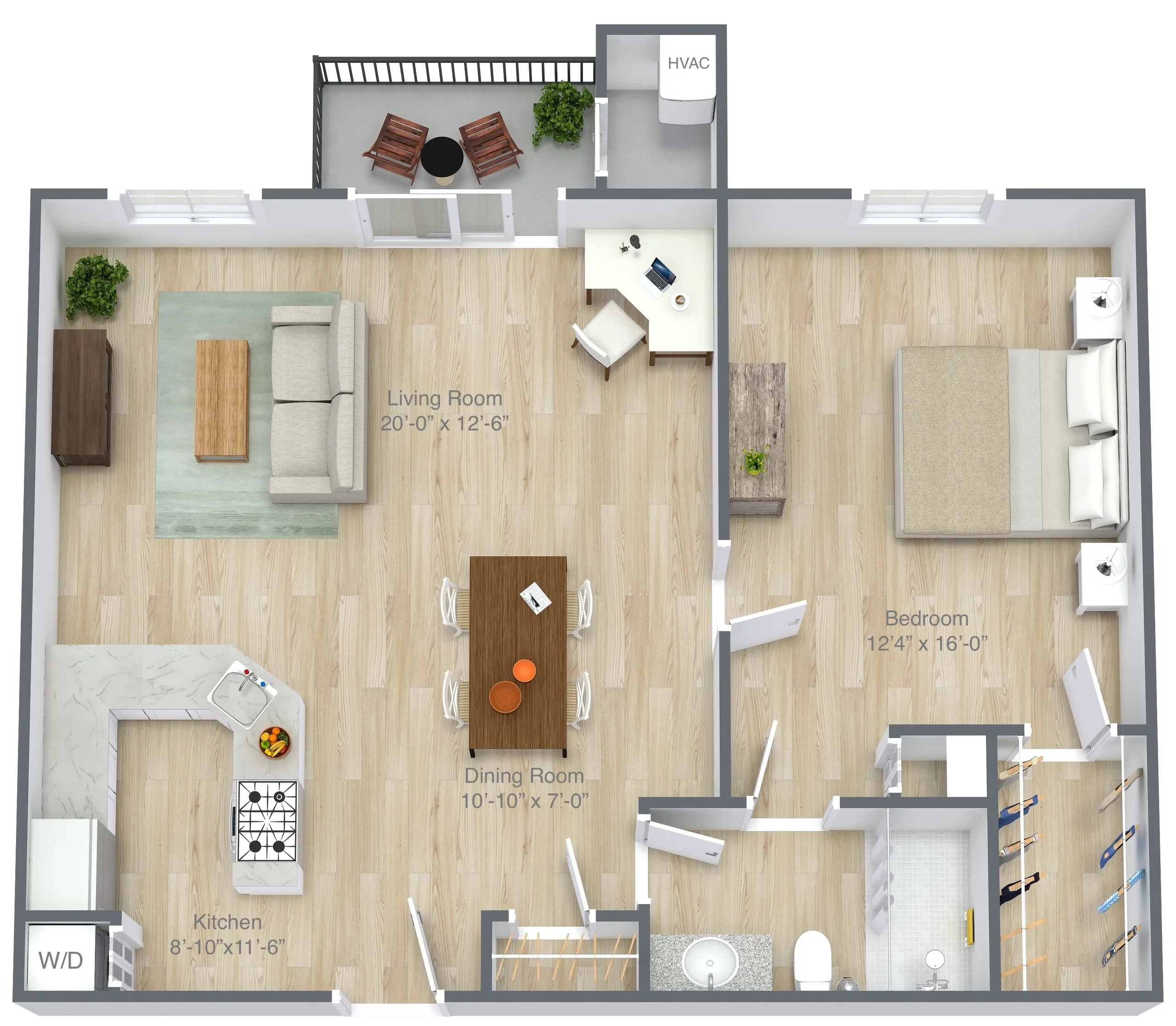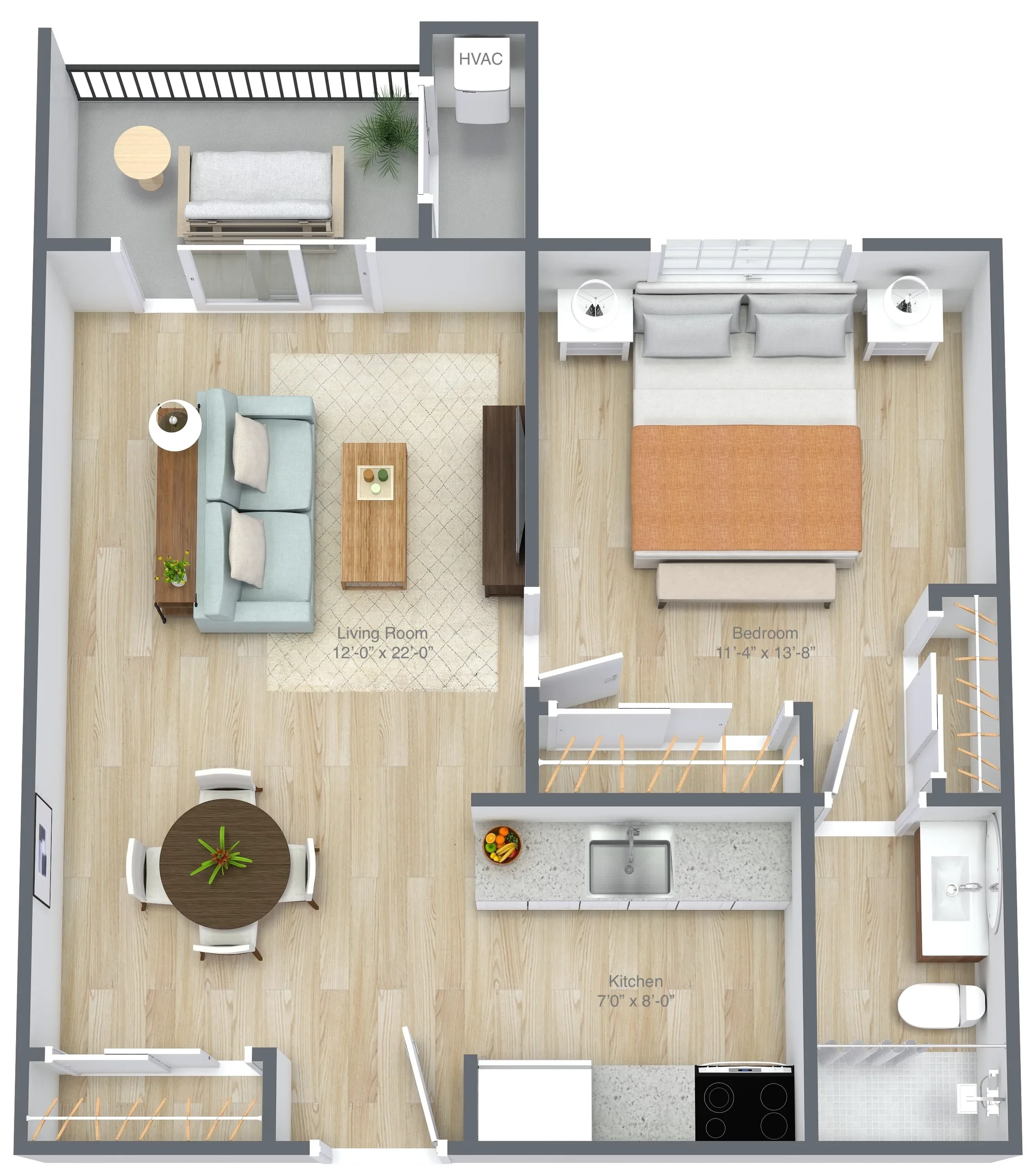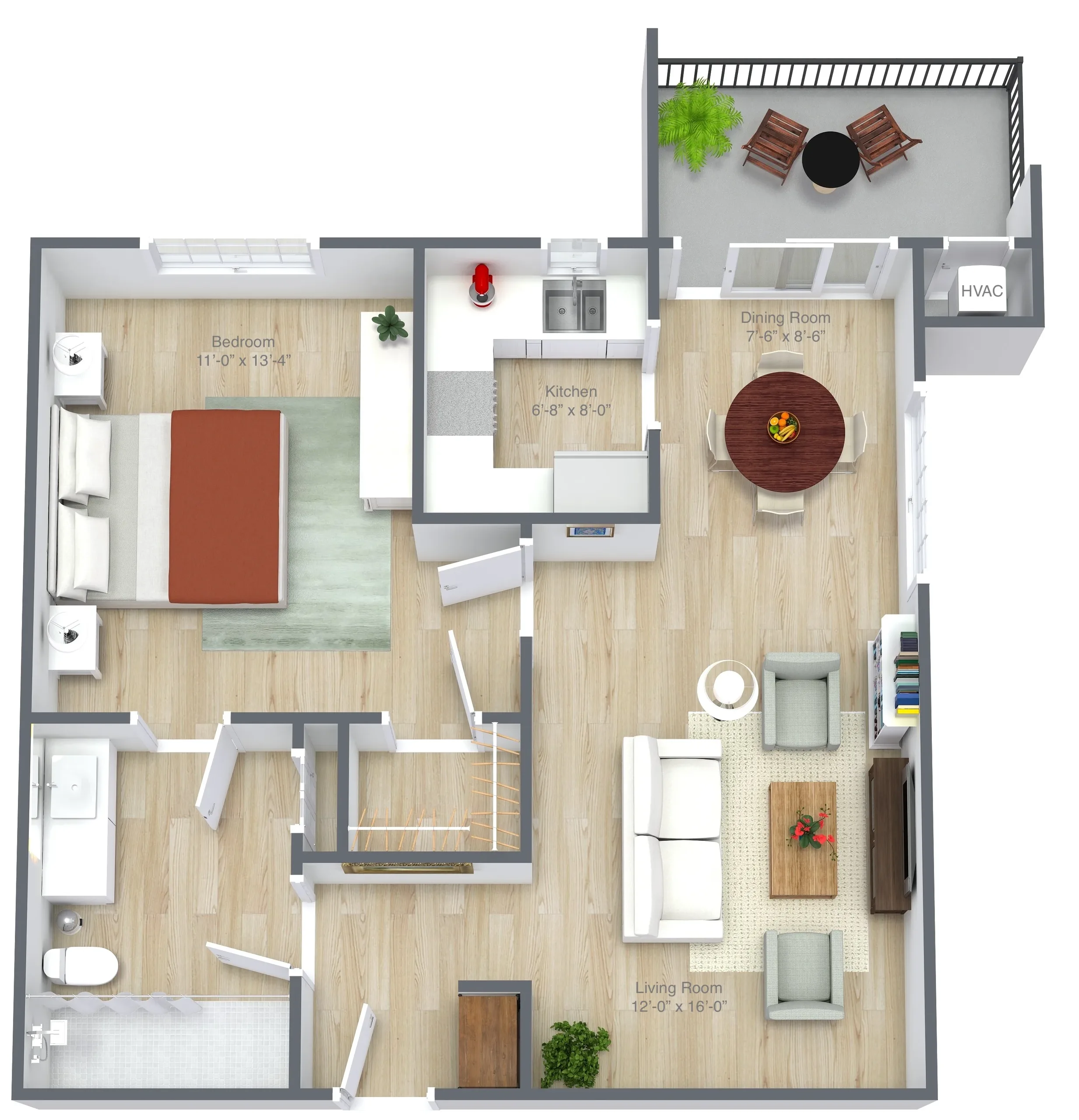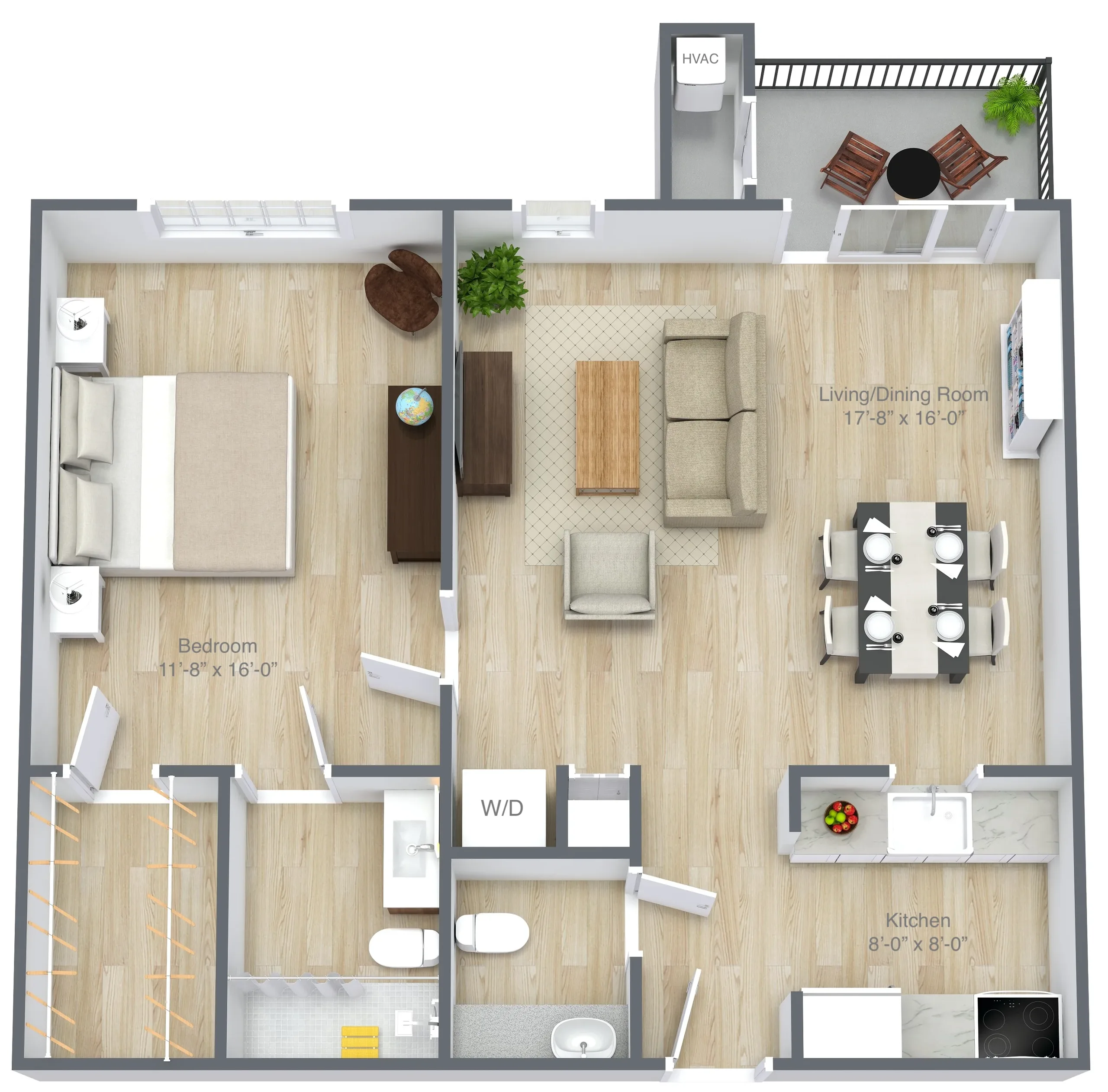 This One Bedroom Traditional features everything you need for your perfect space. The right-sized layout with a dining area adjacent to a modern kitchen, spacious living room and bedroom, and a patio combine to create your very own oasis.
