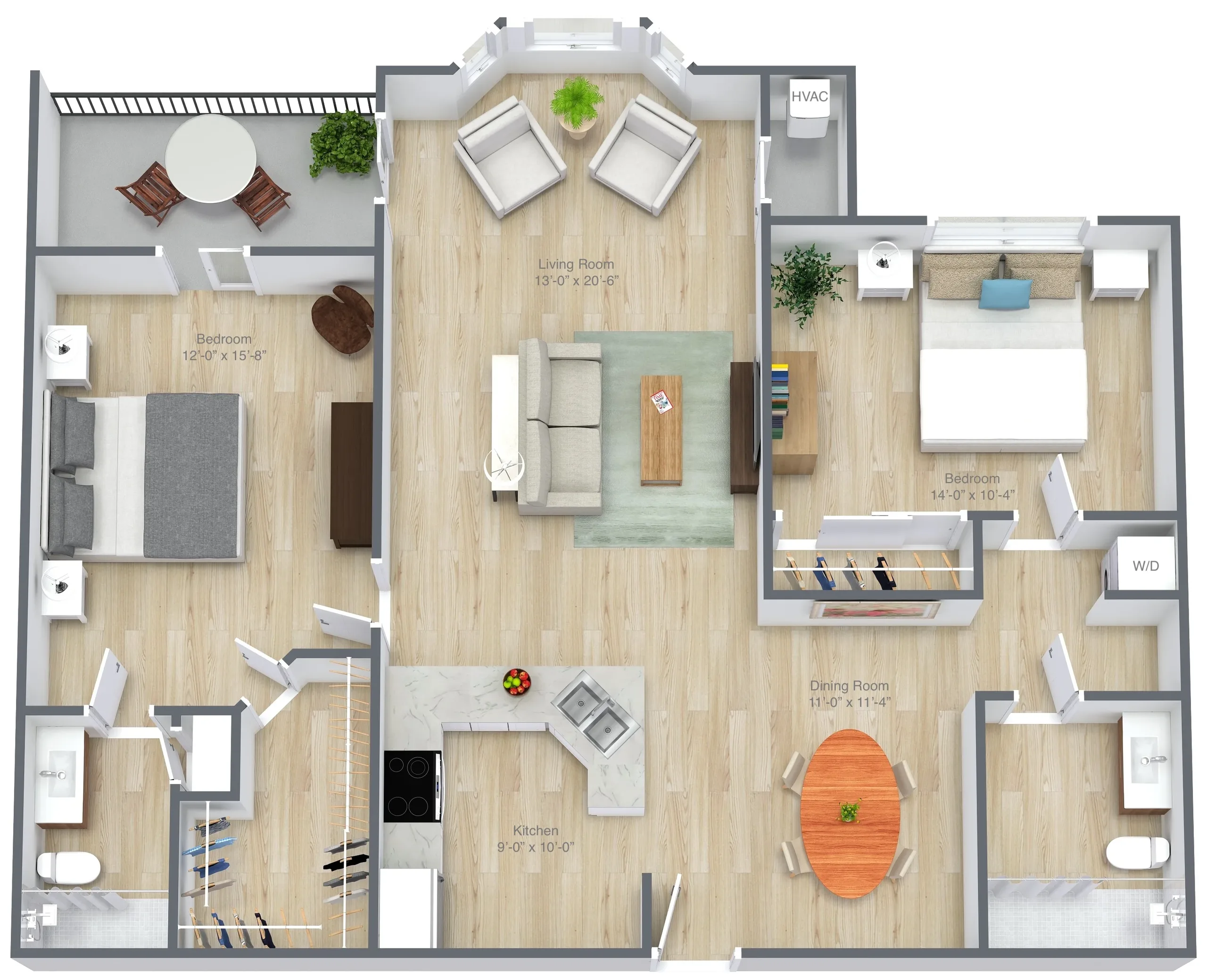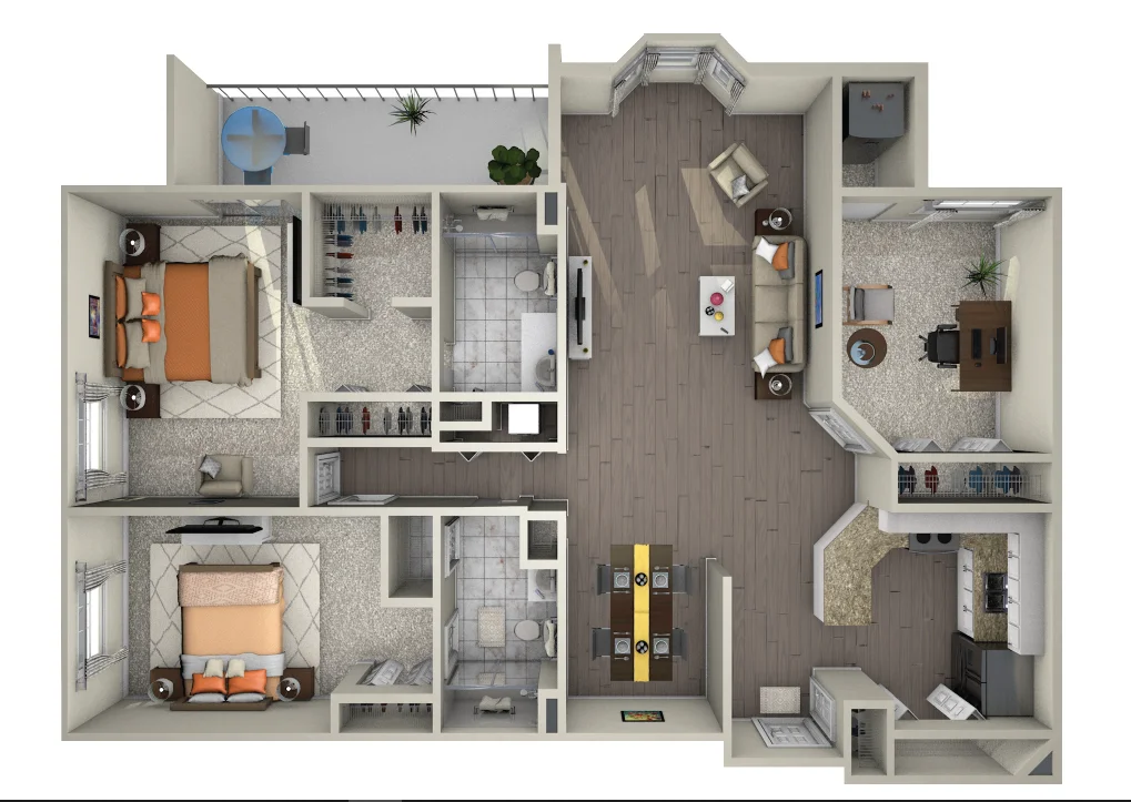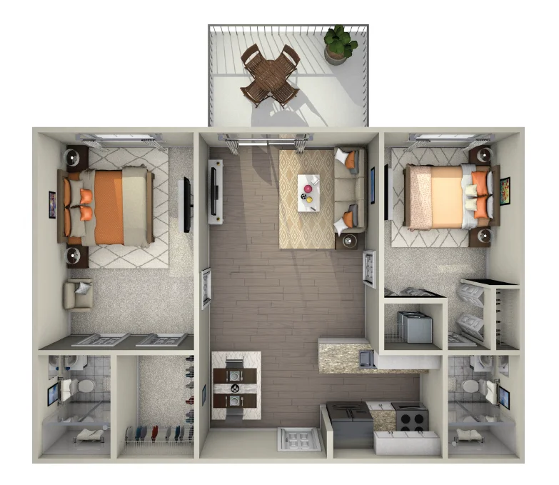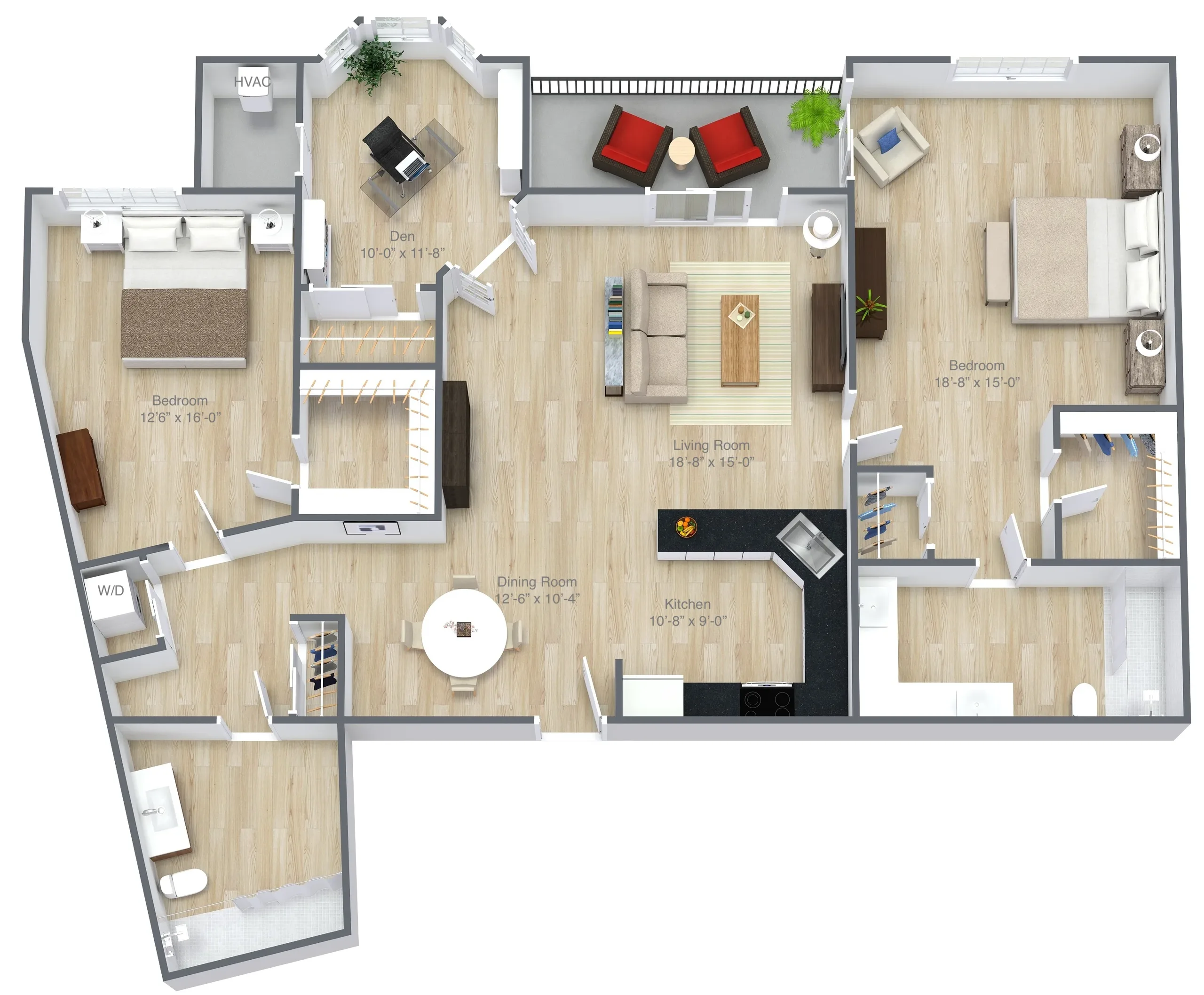 The ultimate option for comfort, the Two Bedroom Deluxe features a large, open design with one private bathroom, one shared bathroom, and a large living area/den space.