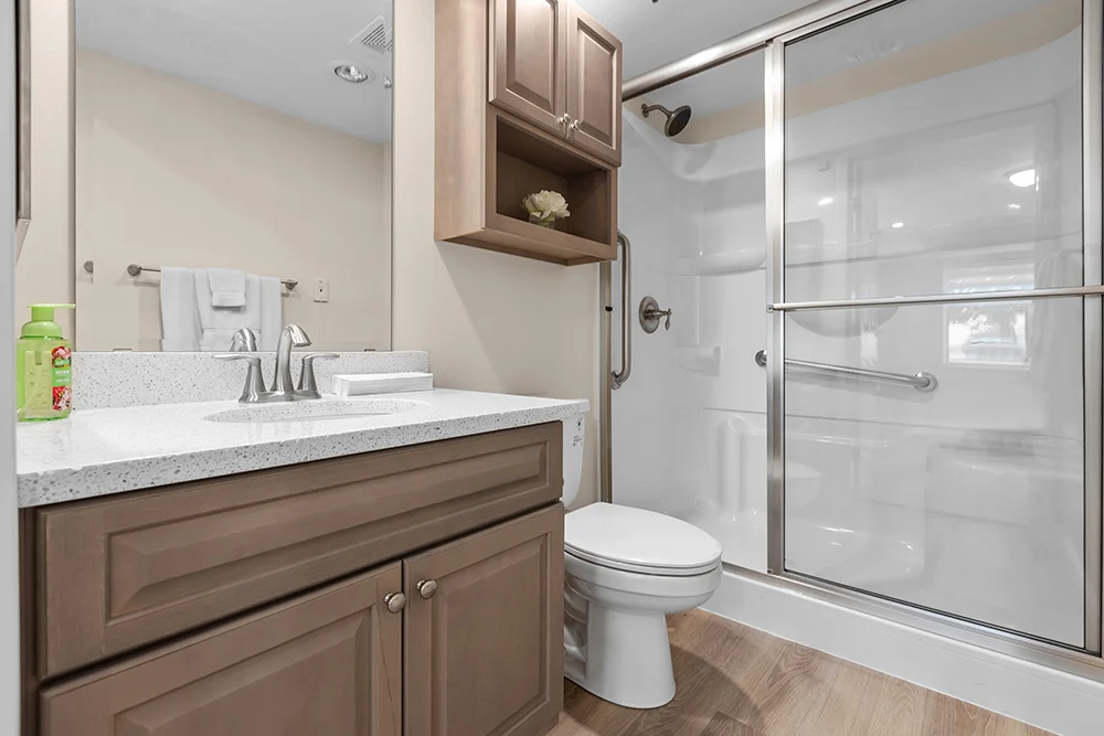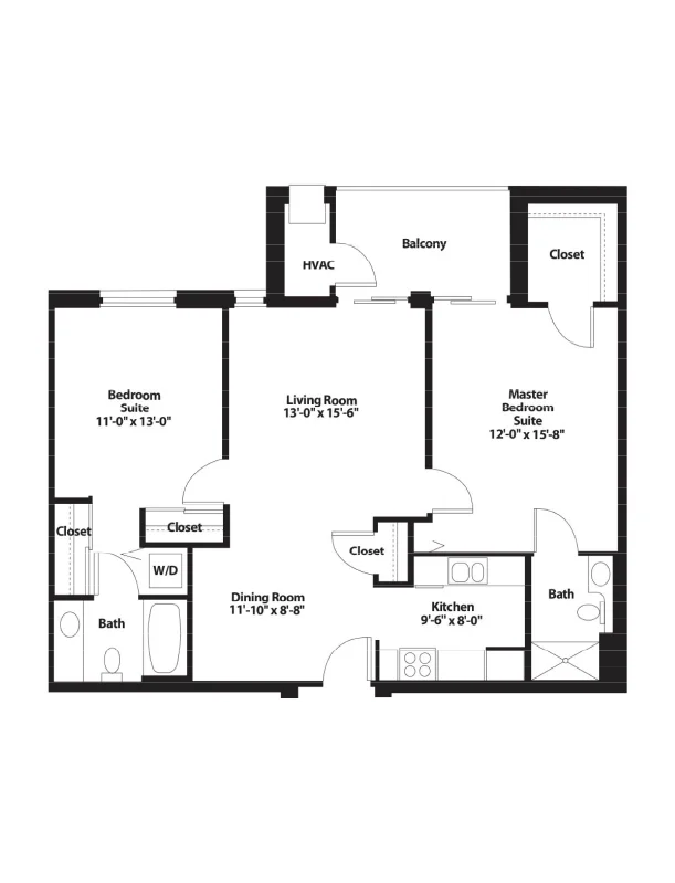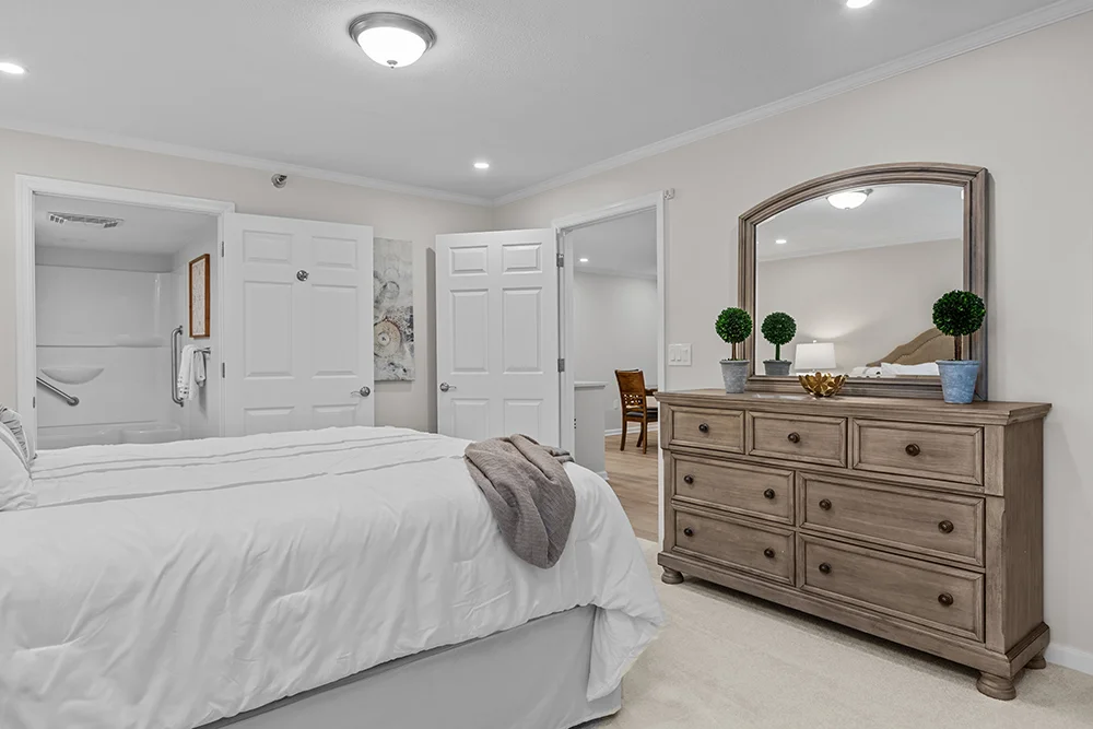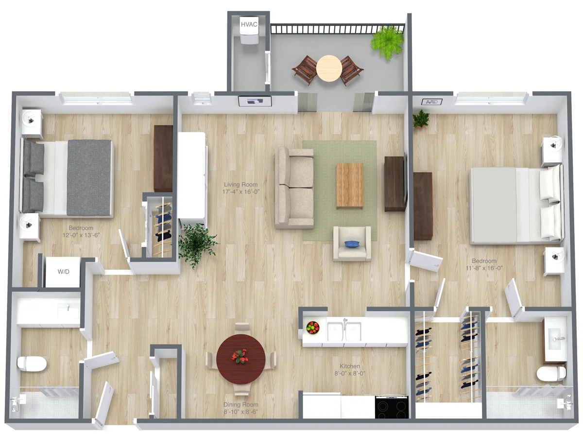 The ultimate option for comfort, the Two Bedroom Deluxe features a large, open design with one private bathroom, one shared bathroom, and a large living area/den space.